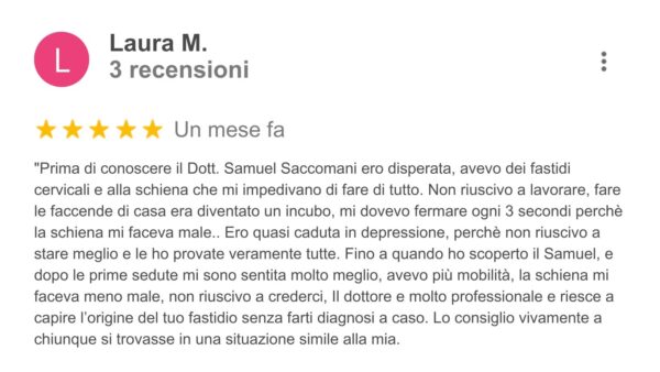 Osteopata D.O. | Dott. Samuel Saccomani | San Bonifacio | Verona 124 recensioni su GooglePubblicato su Greta Bogoni Ottimo professionista !! Mi sta seguendo e aiutando a risolvere un problema alla schiena che ho da anni, è molto paziente e gentile, ti indirizza verso altri specialisti se ne hai bisogno e ti aiuta con vari esercizi da fare a casa.Pubblicato su Sabina Permunian Ragazzo serio attento al suo lavoro dopo tre sedute ho risolto molto anche perché devo dire che erano anni che mi trascinavo dietro problemi di cervicale continua cosìPubblicato su Monica Adami Cordialità, esperienza, manualità e professionalità, esperienza molto positiva lo consiglioPubblicato su isabella celadon Recensione assolutamente positiva, persona professionale educato e molto cortese, spiega le problematiche che riscontra e consiglia cosa fare per prevenire, nel mio caso lavora di manipolazione molto efficaci, arrivata in studio da lui bloccata con schiena cervicale e intorpidimento alle gambe, alla terza seduta tutto in miglioramento…. Consiglio vivamentePubblicato su Maria Milani È da poco che ho conosciuto il dott. Samuel Saccomani ma devo dire che è una persona preparata, disponibile e molto professionale. 👍👍Pubblicato su Gianni Moza Molto bravoPubblicato su adele capucci Samuel è davvero bravo e competente, in poche sedute mi ha risolto un problema alla mandibola che avevo da parecchi anni. Inoltre, dispensa ottimi consigli per esercizi personalizzati da fare a casa. Lo consiglio a tutti!Pubblicato su Katya Pinna Il Dott. Saccomani è una persona molto competente e sopratutto disponibile. Il suo approccio è orientato al paziente a 360 gradi. Lo consiglio vivamente, esperienza assolutamente positiva.Carica di più